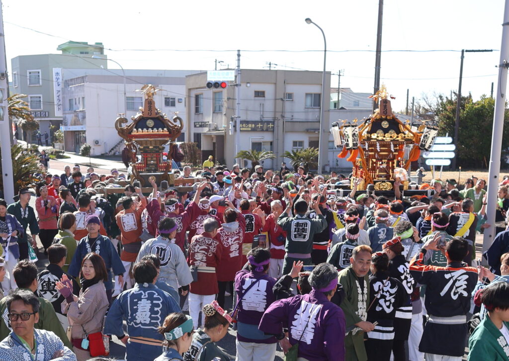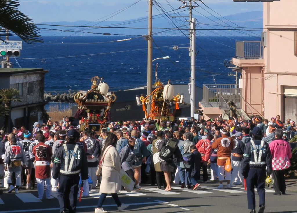 東京・竹芝桟橋からのフェリー便と高速ジェット便に分乗した約350名の担ぎ手が大島町役場前に集結。大島町役場前から本町港までを威勢よくパレードしました。